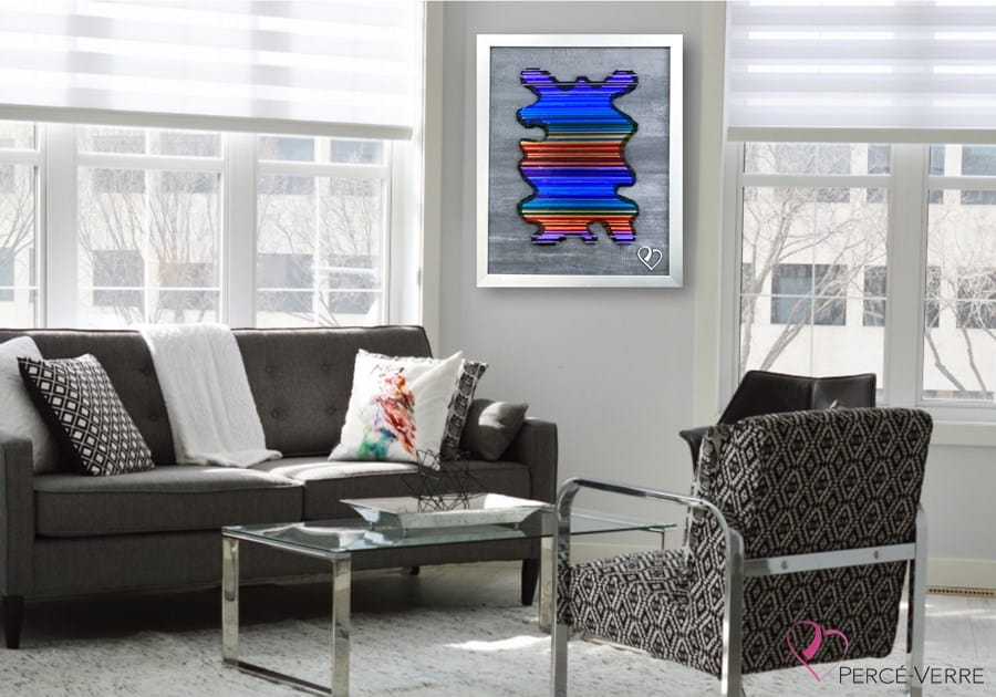 “Aura”: unique modern art deco, backlit This backlit work was created using the fused glass technique. Presented in a frame reminiscent of stainless steel, with a barnwood-style background and an intelligent lighting system that allows the glass to change color a thousand times, fully programmable! Multidisciplinary artist Stéphanie Béland is bursting with original ideas! Gifted at creating and working with her hands, she puts her talent to good use, creating unique, contemporary works of art. Blending various materials with technology, to create wall art with visuals that adapt to the colors of the integrated lighting!
