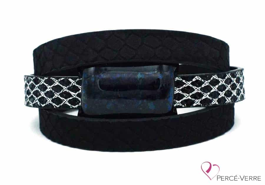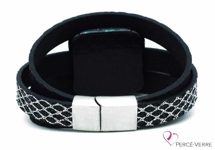 Black and silver leather bracelet for women with handmade fused glass insert. Add chic and boldness to your outfit with this unique piece that reflects your personality!