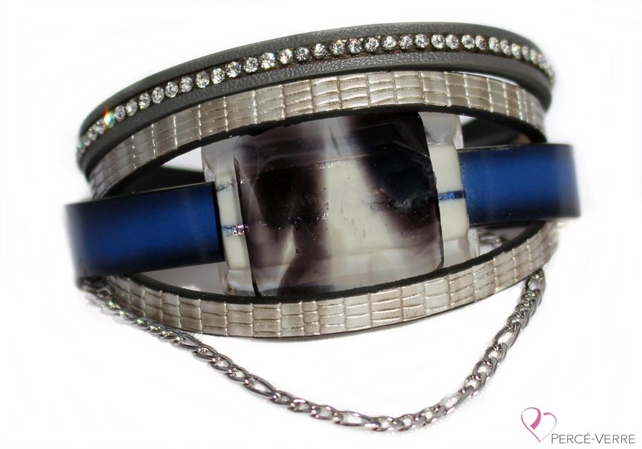 Women’s blue leather bracelet with handmade fused glass insert. Add chic and boldness to your outfit with this unique piece that reflects your personality!