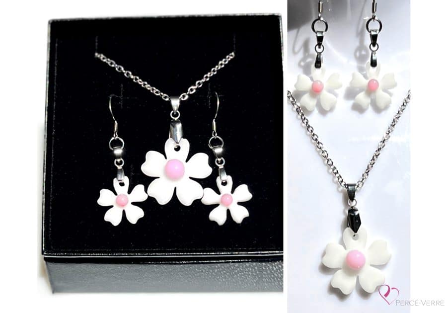 Immerse yourself in floral tenderness and softness with the Bijoux Fleurs des champs “Rose” collection, a creation inspired by the delicate petals of wildflowers in full bloom. This set combines opaque fused glass in shades of soft pink and white with the discreet shine of stainless steel, for a style that’s romantic, fresh and luminous.