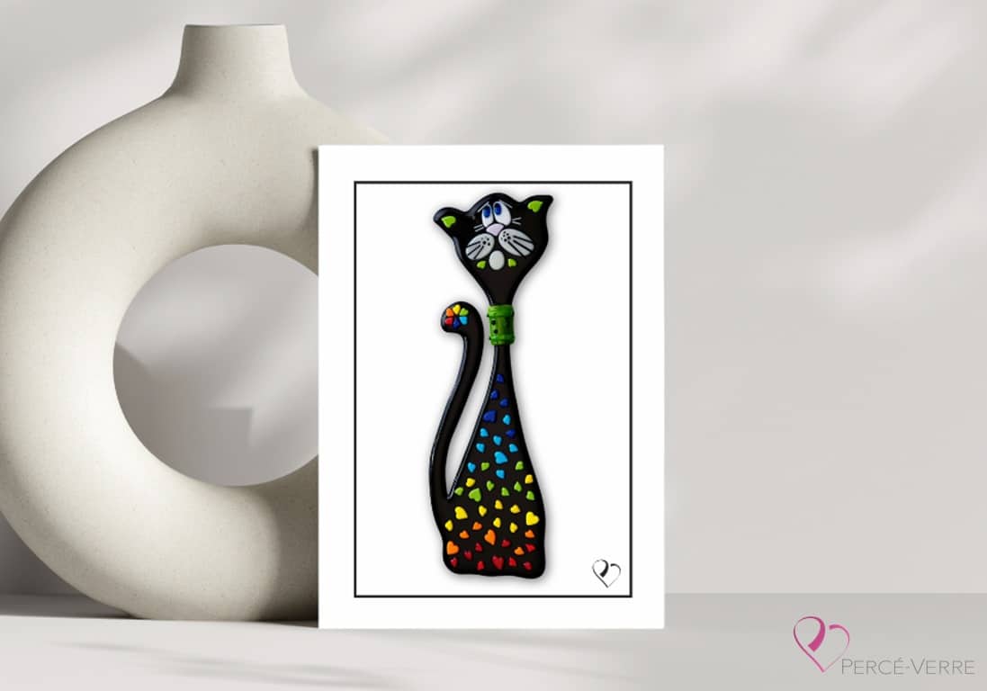 Découvrez l’histoire émouvante de Charpie, le chat aristocrate. Ce dernier a toujours vécu dans son château de verre. Capturé dans la carte de souhaits “Charpie” de la collection Art Déco de Percé-Verre. Son expression figée démontre son incertitude face au monde extérieur, un mélange intrigant d’élégance et de perplexité.