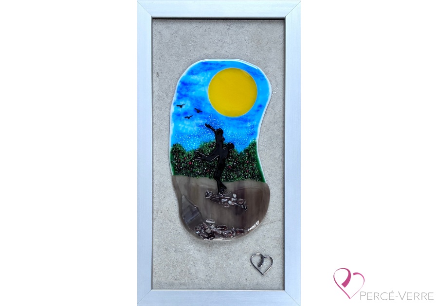 “Libre sous le soleil” is a fused glass creation made in Quebec that celebrates trust, support and the freedom to love fully. The contrast between the deep black of the silhouettes and the golden warmth of the sun creates a vibrant, inspiring presence. The relief of fused glass brings texture, depth and movement to the scene.