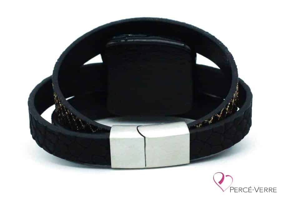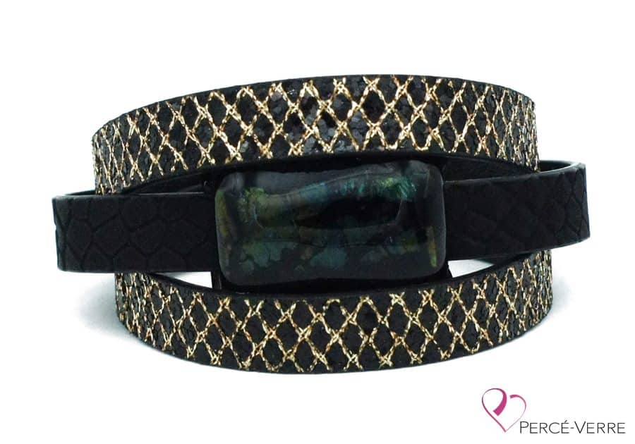 Gold and black leather bracelet for women with handmade fused glass insert. Add chic and boldness to your outfit with this unique piece that reflects your personality!