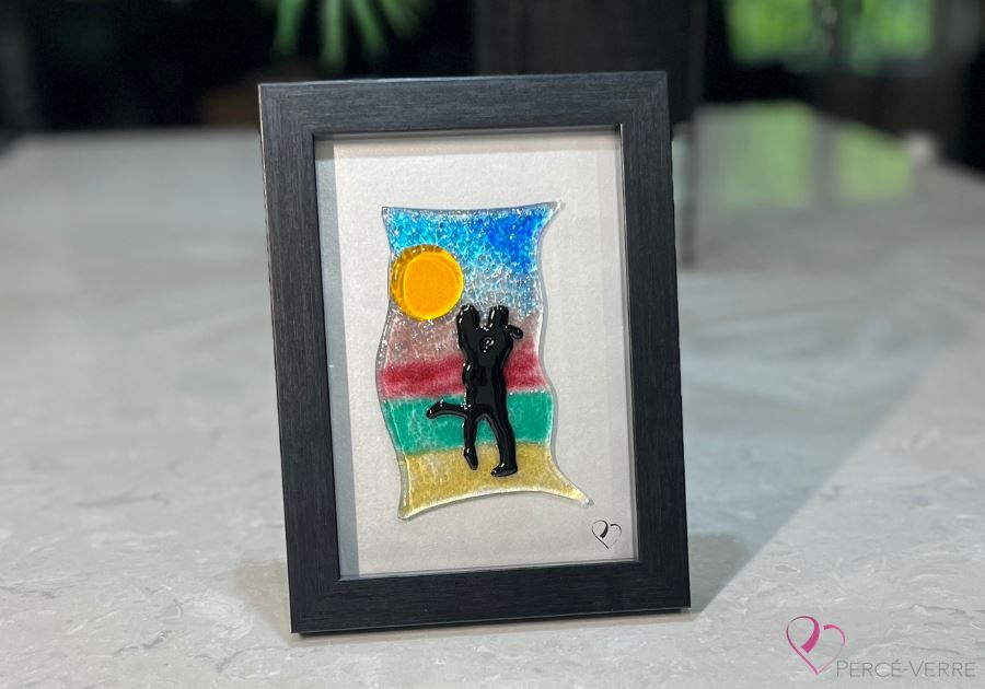 A unique work in fused glass depicting two lovers entwined in a poetic landscape. Created by Percé-Verre, full of emotion and light. Framed, signed and delivered with certificate of authenticity.