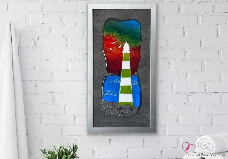 Discover the contemporary work of art entitled “Majesté Marine”, a remarkable piece with its unique style and innovative technology. This fused glass creation is an imposing representation of a lighthouse in the middle of a seascape, evoking the power and beauty of the ocean.