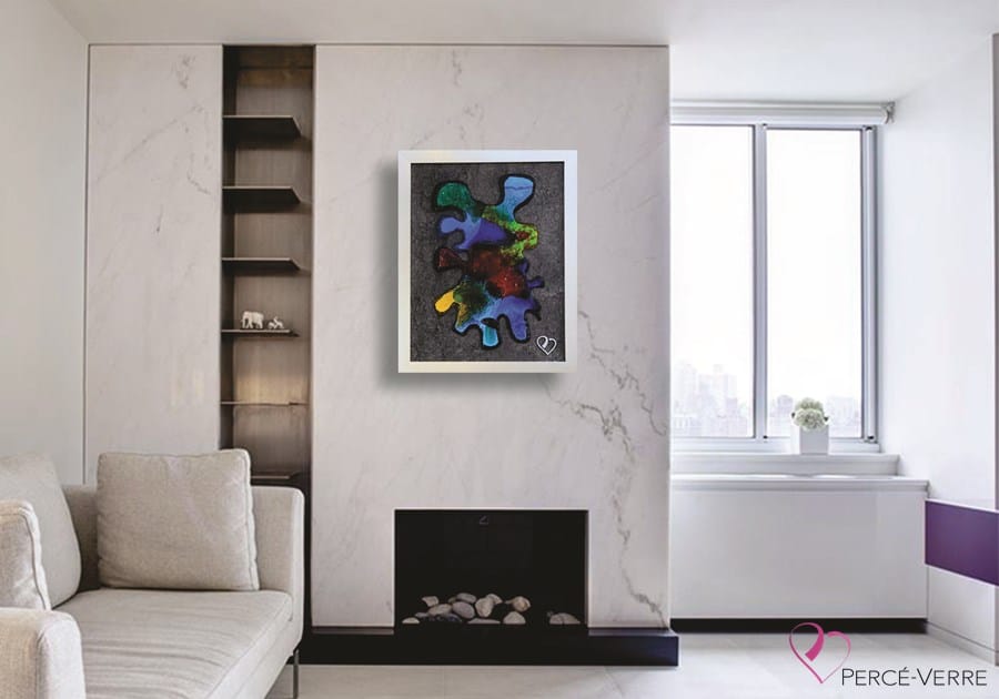 “Nirvana”: unique, modern art deco, backlit This backlit work was created using the fused glass technique. Presented in a frame reminiscent of stainless steel, with a barnwood-style background and an intelligent lighting system that allows the glass to change color a thousand times, fully programmable! Multidisciplinary artist Stéphanie Béland is bursting with original ideas! Gifted at creating and working with her hands, she puts her talent to good use, creating unique, contemporary works of art. Blending various materials with technology, to create wall art with visuals that adapt to the colors of the integrated lighting!