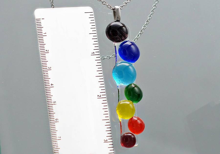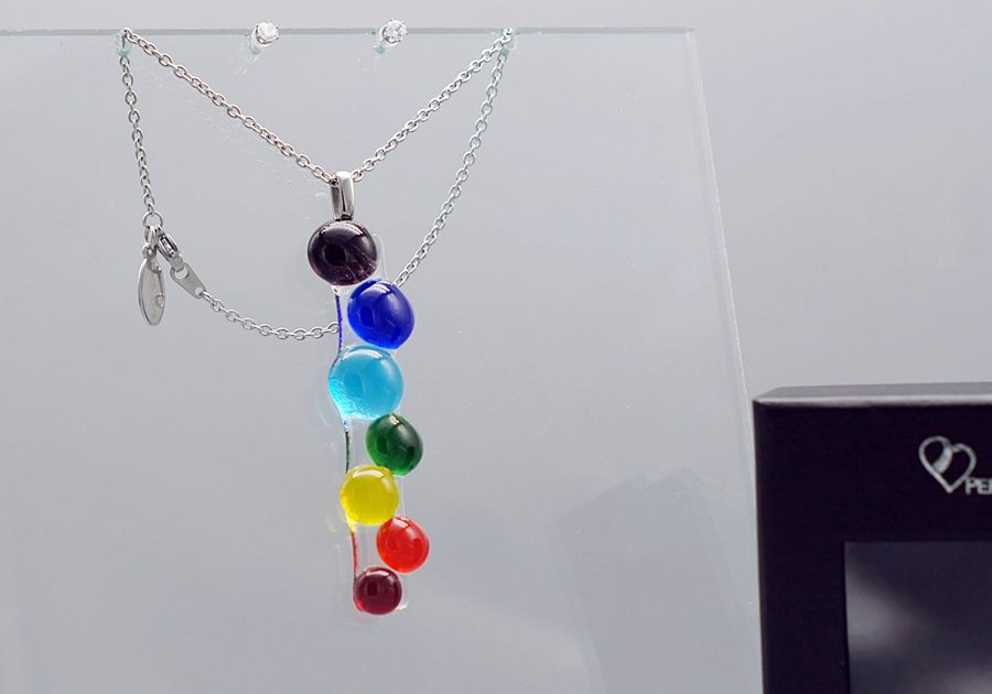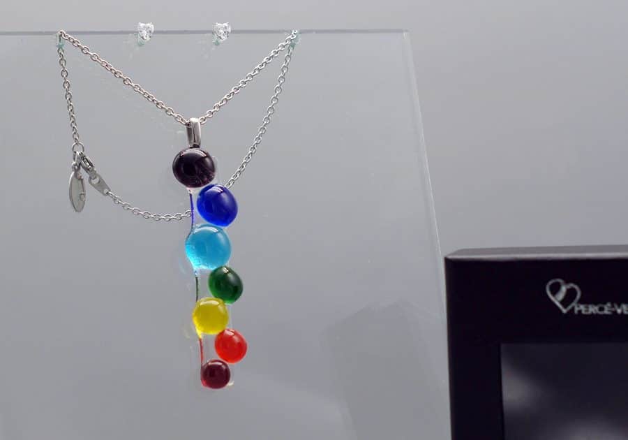 Each piece of jewelry is created with glass pieces in the colors of the seven chakras, which are carefully selected, cut, arranged and fired in a melting furnace. The pendant and earrings are then suspended from a delicate chain and attached to fasteners – all in stainless steel for lasting brilliance.