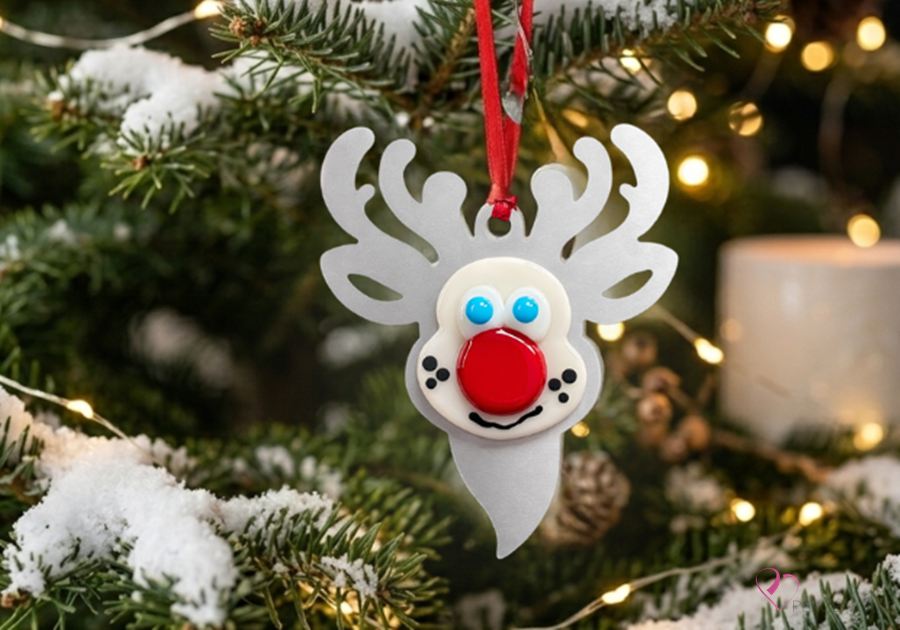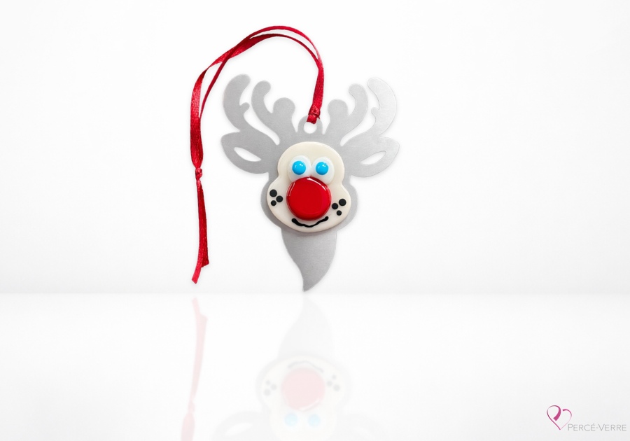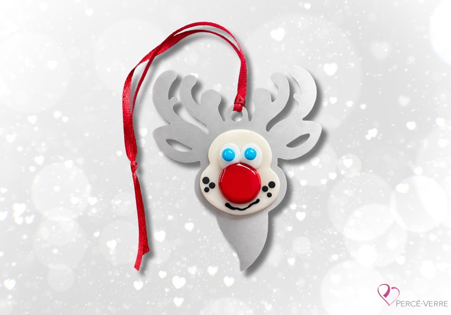 Quebec-made fused glass reindeer ornament – Le Renne au nez rouge