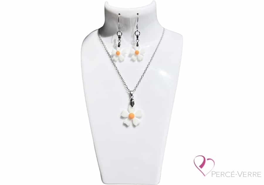 Bright and graceful, the “White & Orange” Wildflower Jewelry set captures the fiery glow of a summer sunrise over wild meadows. Each piece, handcrafted in Quebec, blends crisp white with warm orange tones in luminous fused glass. A perfect harmony of light, warmth, and movement — like petals dancing in the morning breeze.