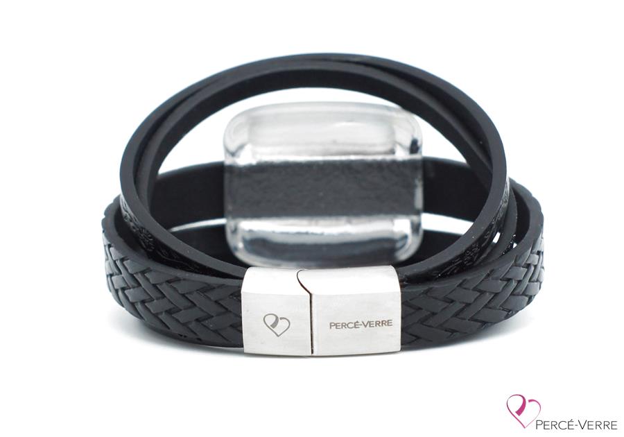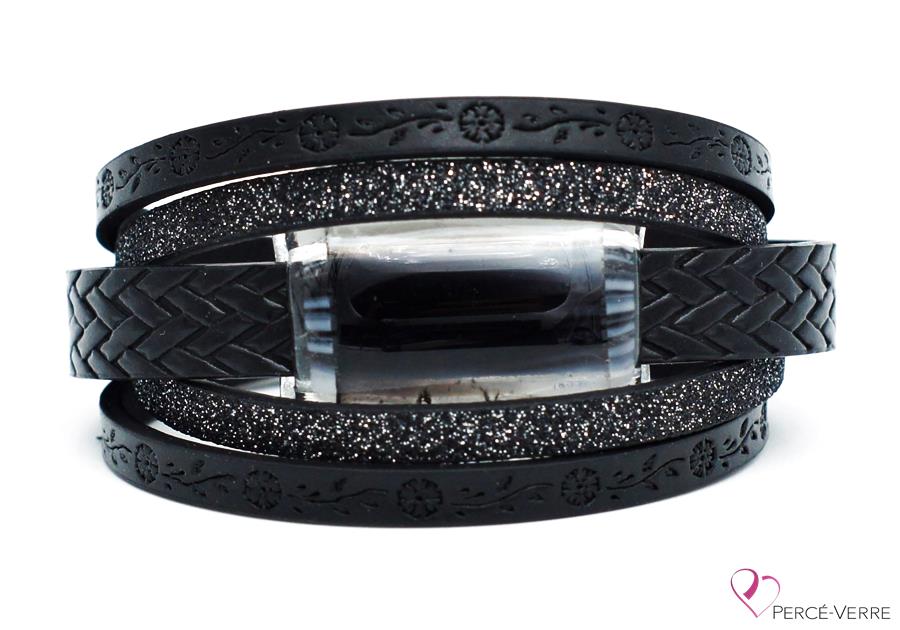 Black leather flower motif bracelet for women with handmade fused glass insert. Add chic and boldness to your outfit with this unique piece that reflects your personality!