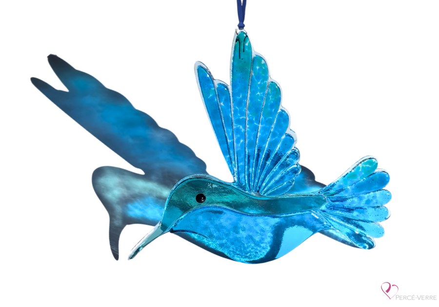 Chaque colibri  est fabriqué à la main au Québec dans l’atelier Percé-Verre. Le verre est chauffé, fusionné puis travaillé avec précision pour créer des textures uniques et des couleurs profondes. Chaque pièce est unique, comme un éclat de lumière capturé dans le verre.