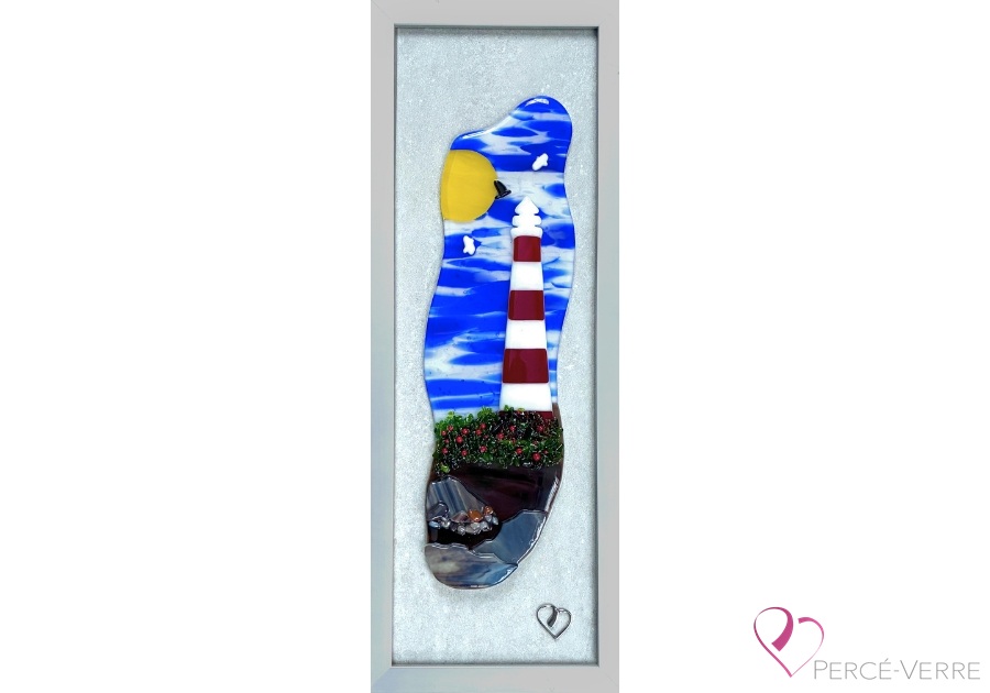 Cette décoration murale en verre fusionné fait main au Québec représente un phare rouge et blanc solidement ancré au bord du rivage, baigné par un ciel bleu profond et un soleil éclatant. Verticale et expressive, cette décoration murale en verre capte immédiatement le regard et apporte stabilité et caractère à votre espace.