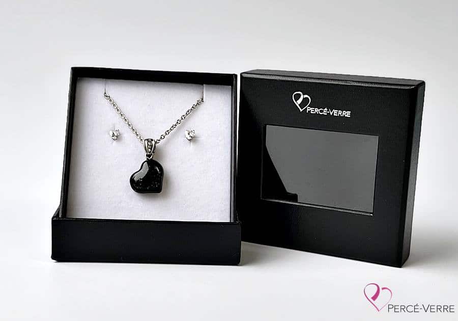 Rayonnez d’originalité avec ce pendentif en verre fusionné en forme de cœur noir scintillant, accompagné de boucles d’oreilles zircons en forme de cœur. Cet ensemble bijoux constitue une excellente idée cadeau pour la Saint-Valentin*! On adore la polyvalence de cet ensemble bijoux, qui se portent autant avec une robe qu’avec un jean.