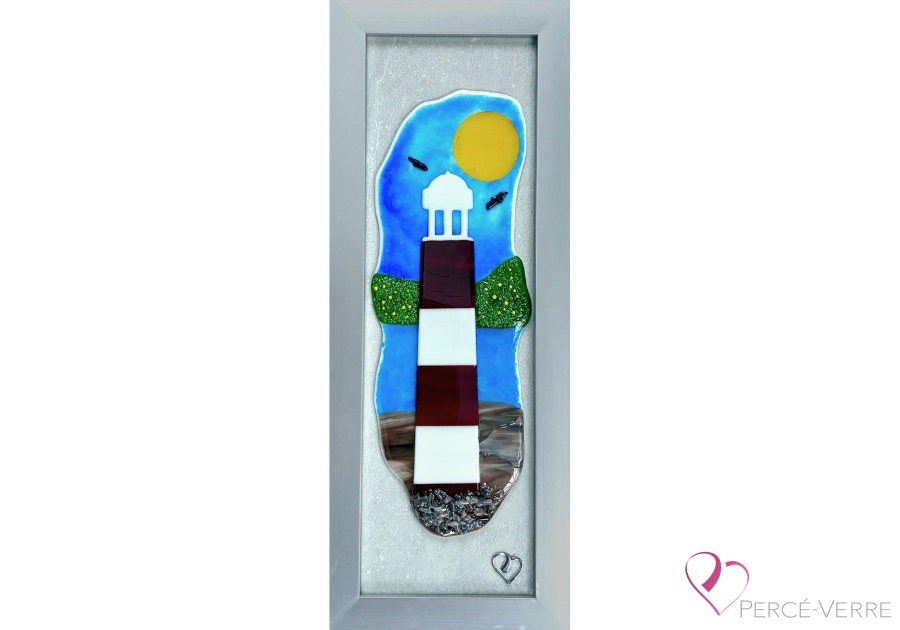 Phare en verre fusionné fait main au Québec. Œuvre murale originale, colorée et symbolique inspirée du bord de mer.
